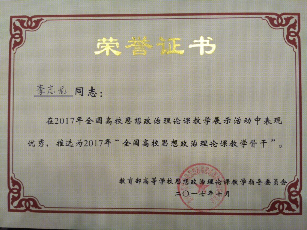 公司教师李志龙荣获“全国高校思想政治理论课教学骨干”荣誉称号