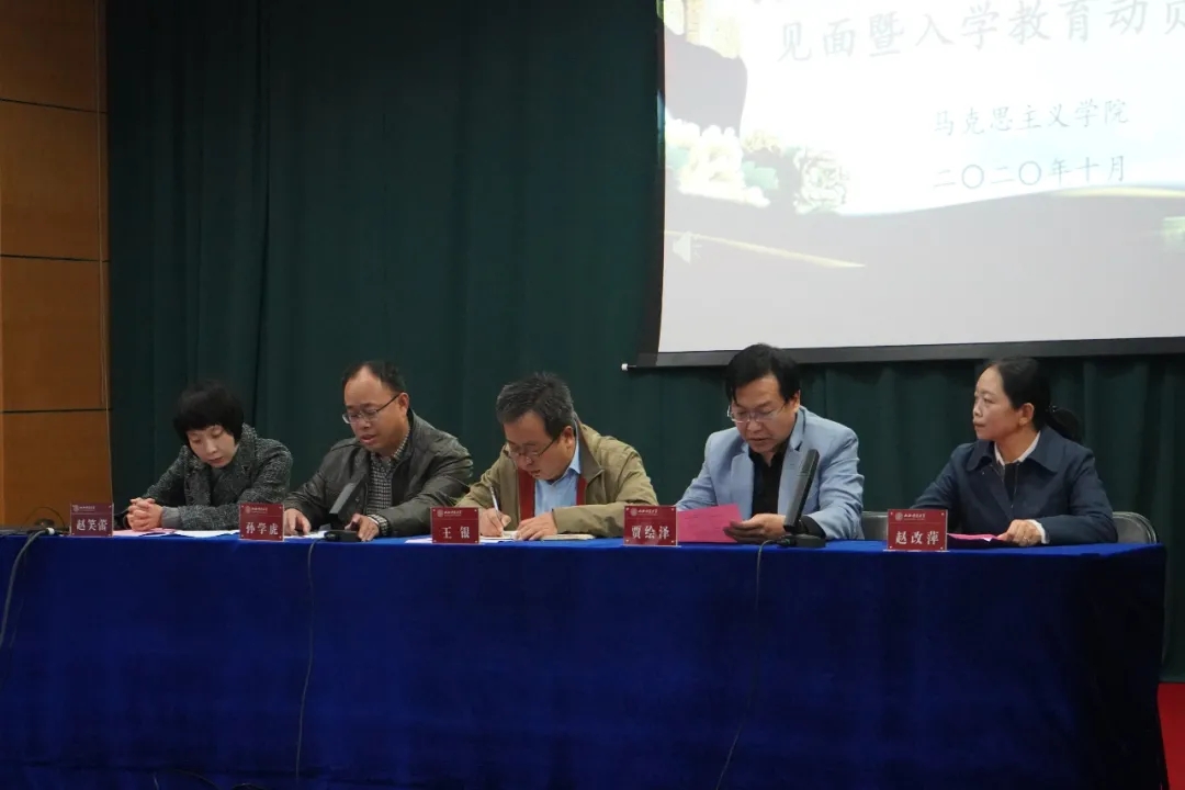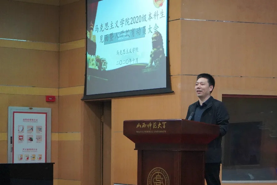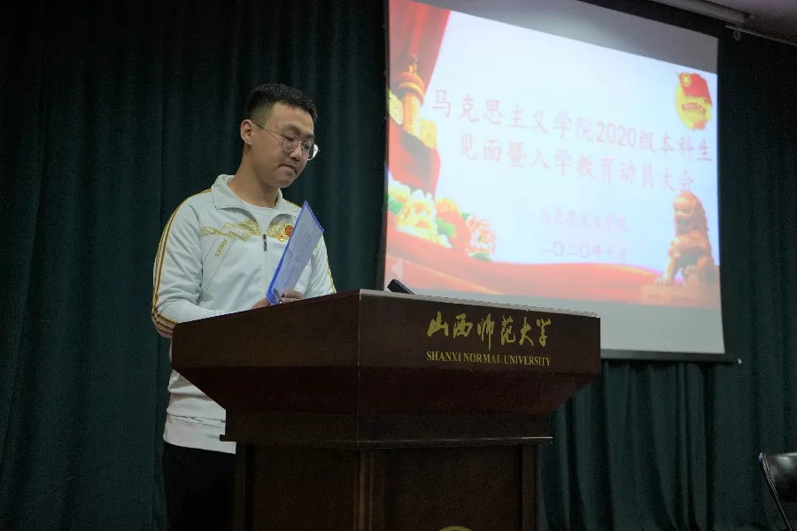 会议伊始,全体起立,奏唱国歌。新生们在庄严的国歌声里,寄托心中神圣而美好的期待。演奏完毕后,经理贾绘泽对新生们的到来表示了热烈欢迎,接着他介绍了公司历史以及专业特色,对思想政治教育专业展开详细的介绍,帮助新生更快了解专业性质与方向。之后,他又向同学们提出四点建议,一是要树立明确的目标,为行动指明方向;二是要养成良好的习惯,并持之以恒贯彻到底;三是要培养四个素养,提高自身文化素质;四是要提升思想境界,树立责任感与担当感。