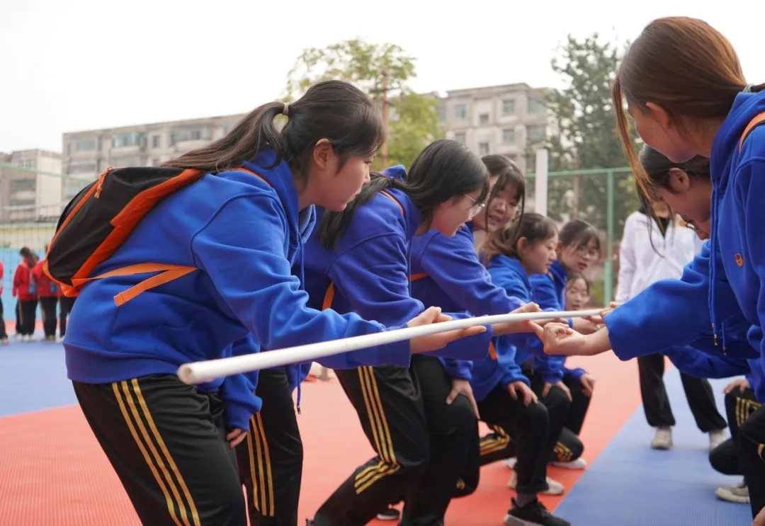 接着,是第二项素拓项目—“齐眉棍”。同学们,十人一组,五五相对,棍子的初始高度为成员眉毛的平均高度,每人用一根手指同时将棍子放到地上,在此过程中,棍子不能弯曲,且每个人的手指应同时离开。同学们吸取第一个项目的经验教训,仔细询问规则,互相帮忙,努力弥补身高差距,圆满完成任务。