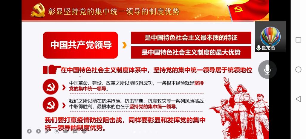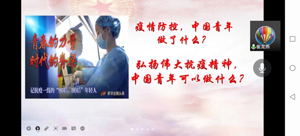 崔老师以“疫情大考中的中国力量”为题,从抗击新冠肺炎疫情彰显党的领导力、彰显中国特色社会主义的制度优势、弘扬伟大抗疫精神彰显中国青年本色三个方面总结了疫情大考中党的力量、制度的力量和精神的力量,并突出了疫情大考中中国青年的青春担当,鼓励经历抗疫大战洗礼的中国青年提高站位、坚定信心,增强本领、勇于担当,严守纪律、树牢底线,不惧艰险、迎难而上,牢记习近平总书记教导,投身强国伟业,在实现中华民族伟大复兴中国梦的新长征路上奋勇搏击!