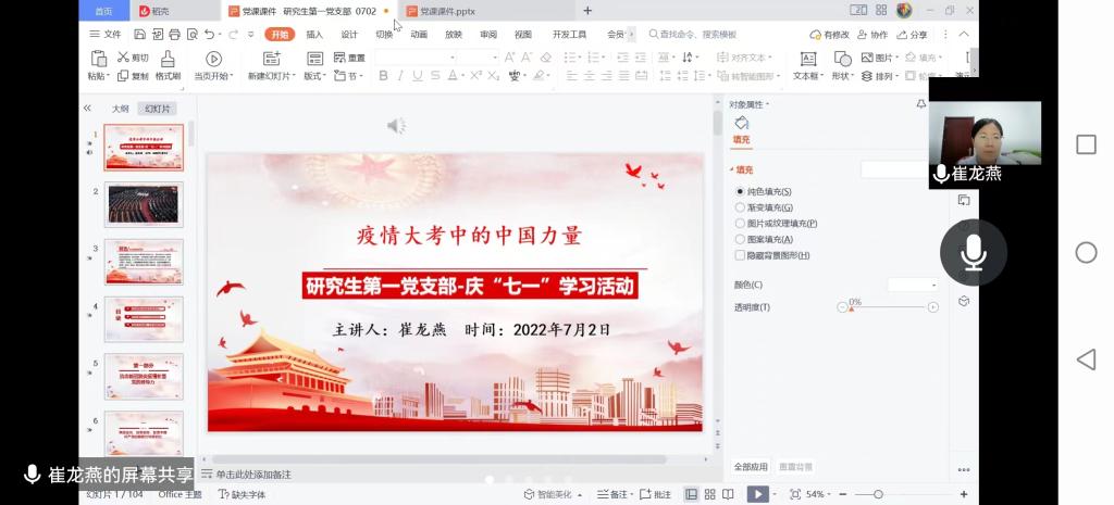 根据公司党委组织部《关于开展庆祝中国共产党成立101周年活动的通知》要求,结合“党课开讲啦”活动,7月2日晚,beat365唯一官网研究生第一党支部以组织委员崔龙燕老师讲党课为主要内容开展“喜迎二十大,奋进新征程”主题党日活动。全体党员参加,公司党委委员、副经理赵改萍列席。
