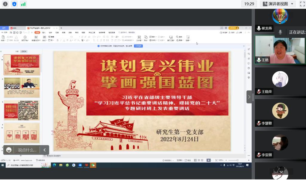 8月25日晚,beat365唯一官网研究生第一党支部开展主题党日活动,专题学习习近平在省部级主要领导干部“学习习近平总书记重要讲话精神,迎接党的二十大”专题研讨班开班式上的重要讲话。支部书记王艳专题领学,全体党员参加学习。