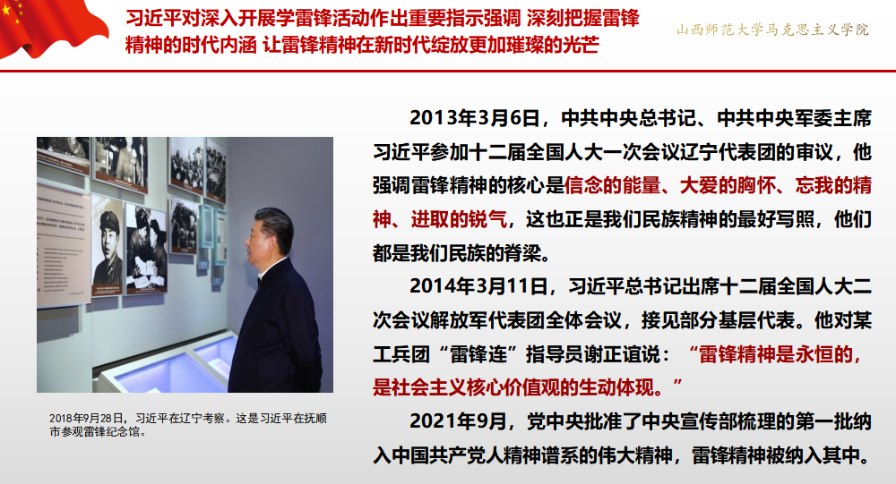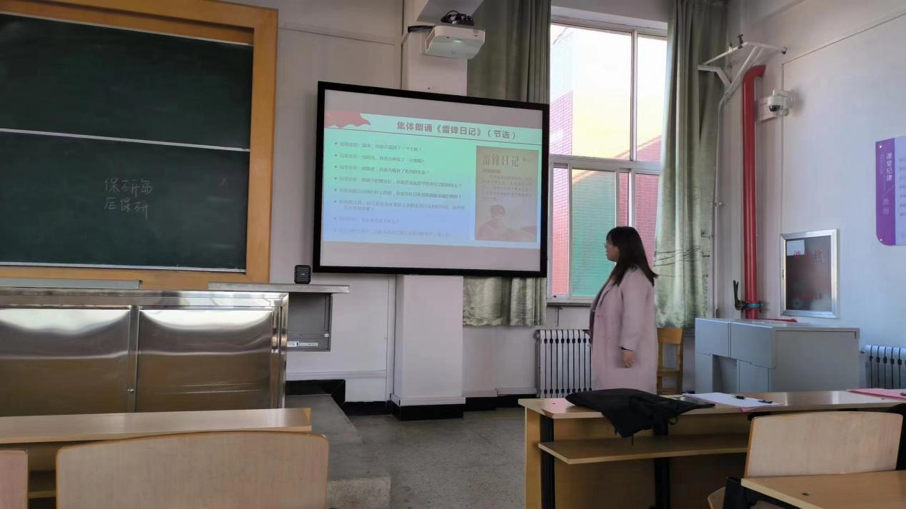 活动第四项,与会人员集体朗诵《雷锋日记》。值此纪念“向雷锋同志学习”题词发表60周年之际,安慧芳老师领学了习近平总书记近期对深入开展学雷锋活动作出的重要指示,强调雷锋精神的核心是信念的能量、大爱的胸怀、忘我的精神、进取的锐气,这也正是我们民族精神的最好写照,他们都是我们民族的脊梁。雷锋精神是永恒的,是社会主义核心价值观的生动体现。铿锵有力的朗诵声在教室回响,雷锋同志的精神在同学们心中回荡。