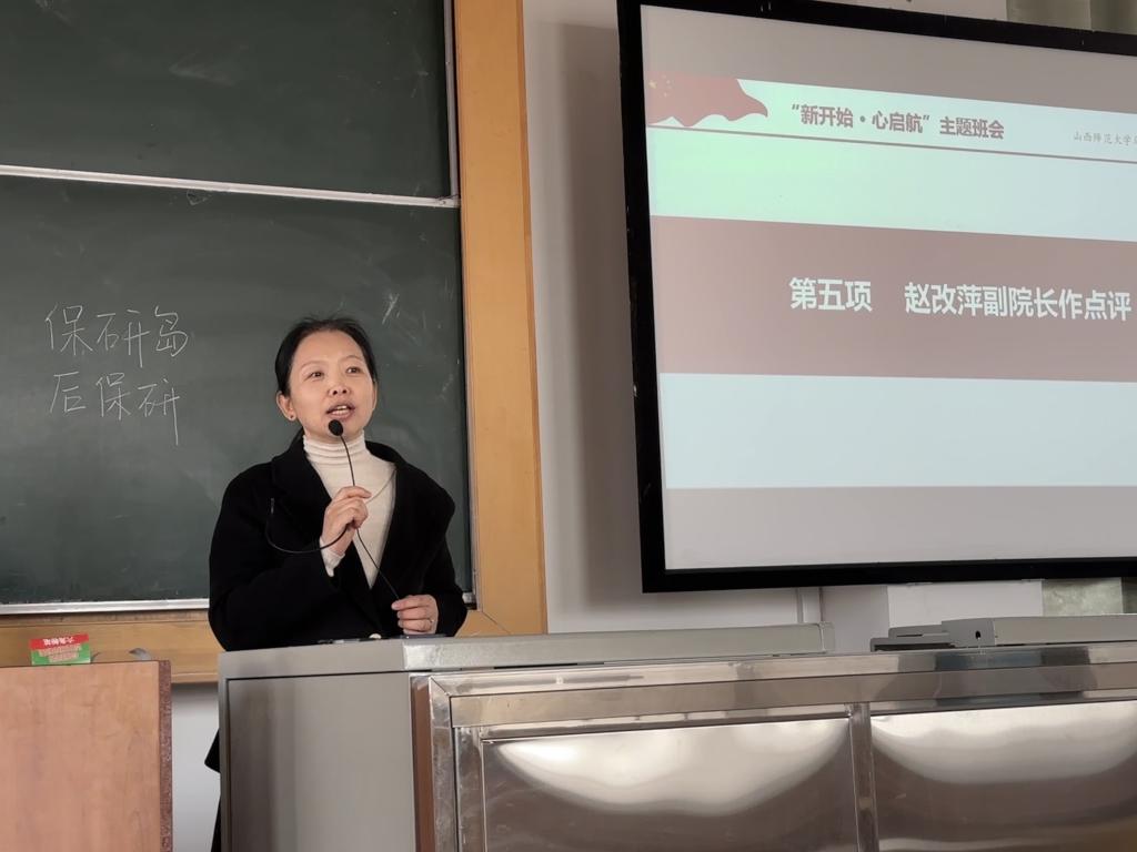 活动第五项,赵改萍副经理对此次班会作点评。赵经理肯定了联系班级对此次活动的充分准备,从《青年在选择职业时的考虑》和《雷锋日记》两篇经典文献的共性谈起,强调立足新时代新征程,中国青年的奋斗目标和前行方向归结到一点,就是坚定不移听党话、跟党走,努力成长为堪当民族复兴重任的时代新人;同时,也从学会学习、学会做人和学会思考三个层面为大家作辅导,引导同学们树立终身学习、广泛学习和深度学习的理念,把对祖国血浓于水、与人民同呼吸共命运的情感贯穿学业全过程、融汇在事业追求中。