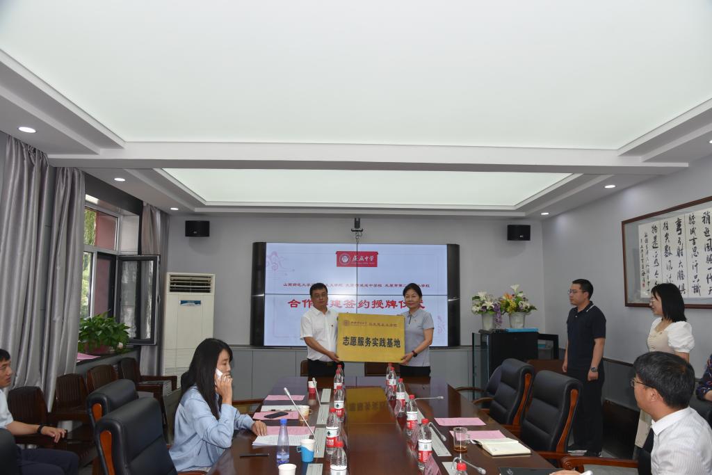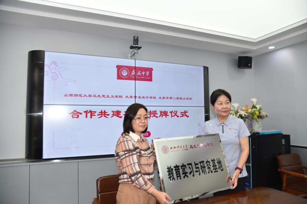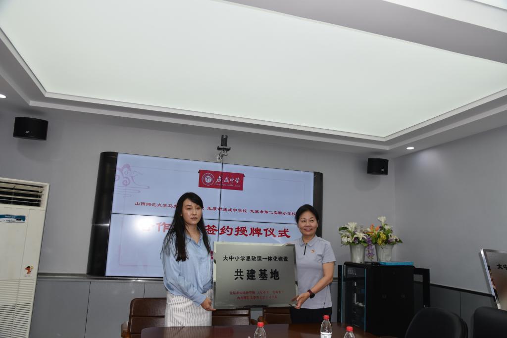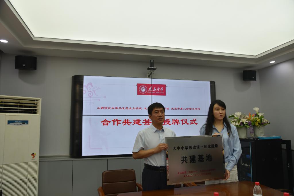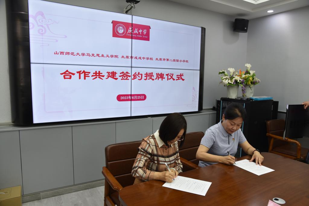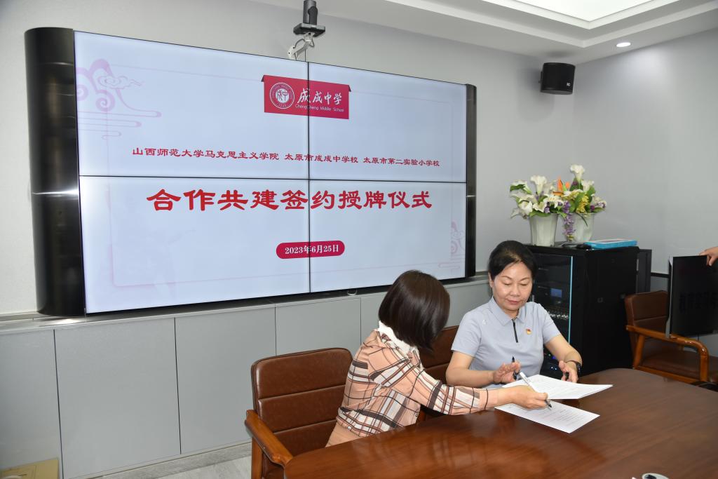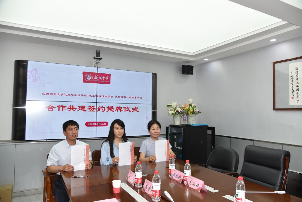 2023年6月25日上午,beat365唯一官网与太原市成成中学校、太原市第二实验小学大中小学思政课一体化建设共建基地、教育实习与研究基地和志愿服务基地签约授牌仪式在太原市成成中学校迎泽校区隆重举行。