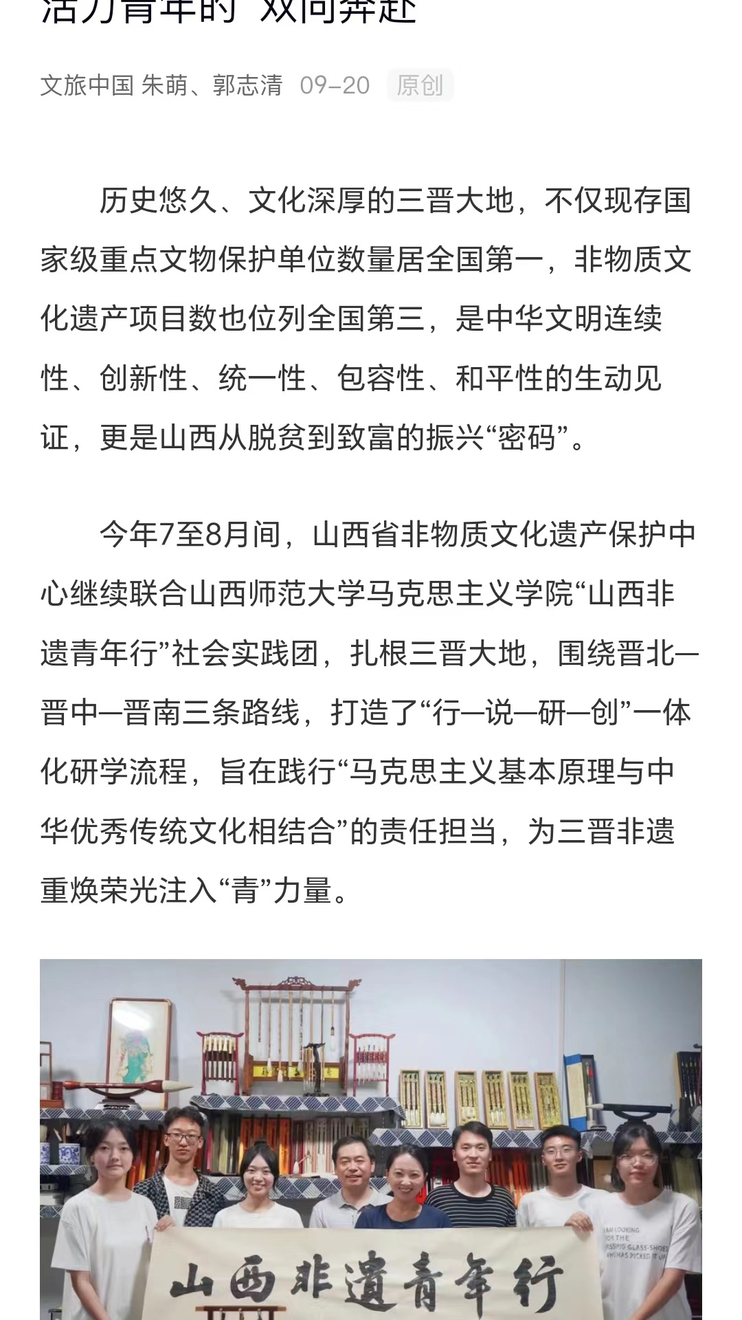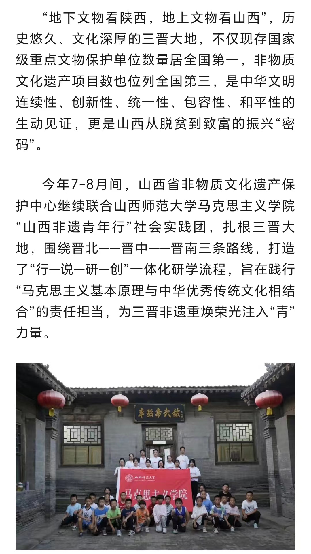 在践行“两个相结合”的深入推进下,公司200余名“山西非遗青年行”团队队员沿着习近平总书记考察山西的重要足迹,循着三晋大地历史文化脉络,通过“线上+线下”共研共学的方式,深入省内10余个县市,走访了非遗项目50余处,全方位感受了山西非遗文化的独特魅力,领略非遗传承人在平凡中创造不凡、追求卓越、精益求精的“工匠精神”。团队成员们用脚步丈量三晋大地,用文字诠释非遗魅力,用行动传承非遗精神,践行“马克思主义基本原理与中华优秀传统文化相结合”的责任担当,为三晋非遗重焕荣光注入“青”力量。