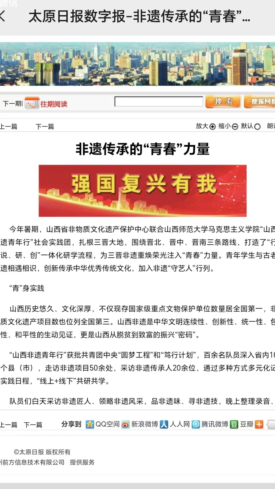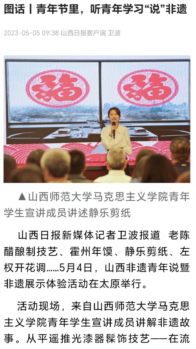 公司坚决贯彻习近平总书记关于高校思想政治工作和青年工作的重要论述,将非遗文化引入思政课堂建设,通过“理论学习+实践调研+理论宣讲”的思政育人体系,构建起“思政+非遗”平台,致力于打造德育“新高地”。此外,公司还开展了传统手工艺品征集、书签制作、“红包添福”创意设计等“非遗青年创”系列活动,从“两个相结合”出发,赋予优秀传统文化以新的时代表达。同时,公司以“山西非遗青年行”研学活动为主阵地,设立院级课题和创新项目,引导青年走进非遗,探索“大思政”视野下山西非遗“活”起来的时代密码。