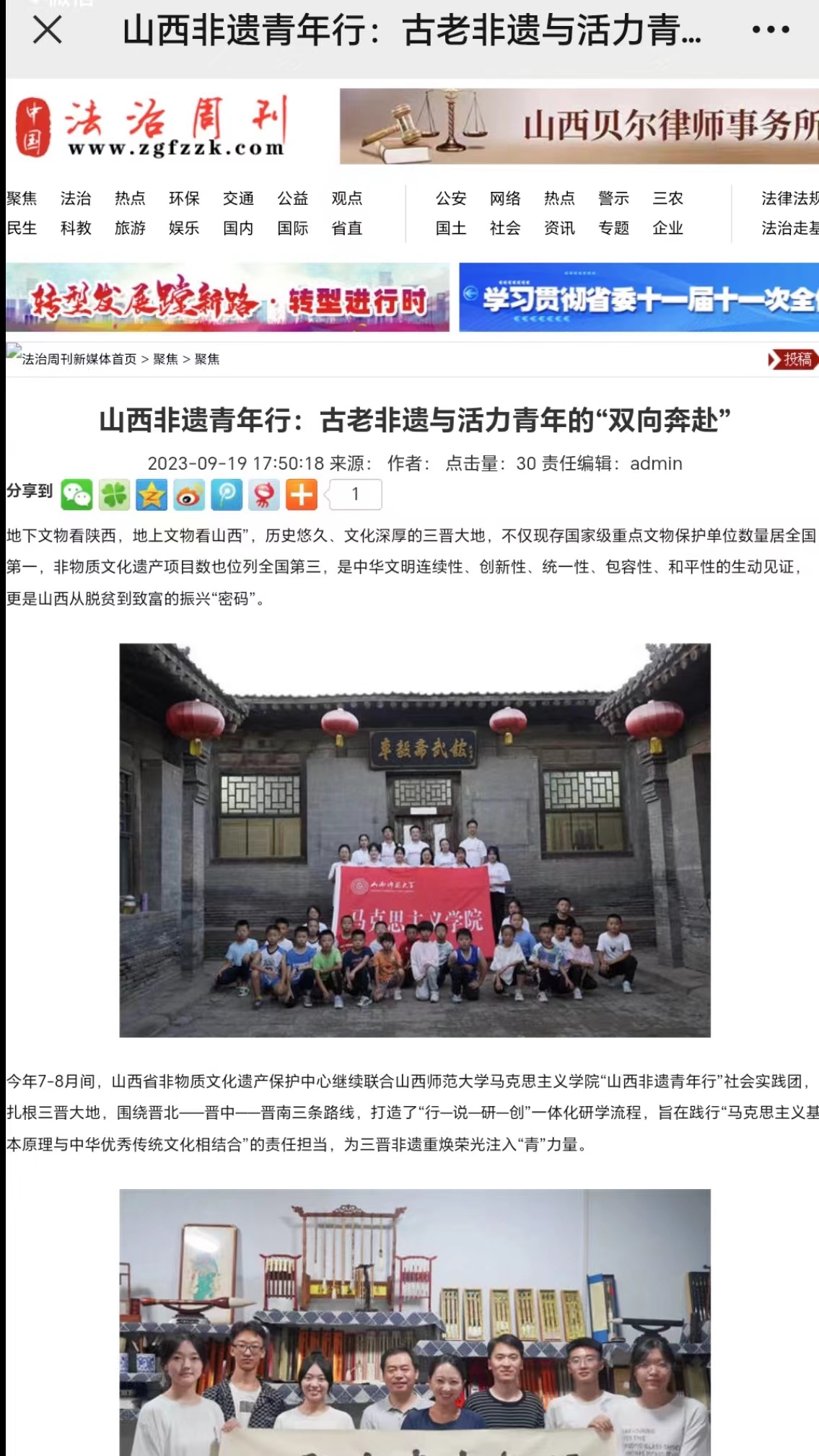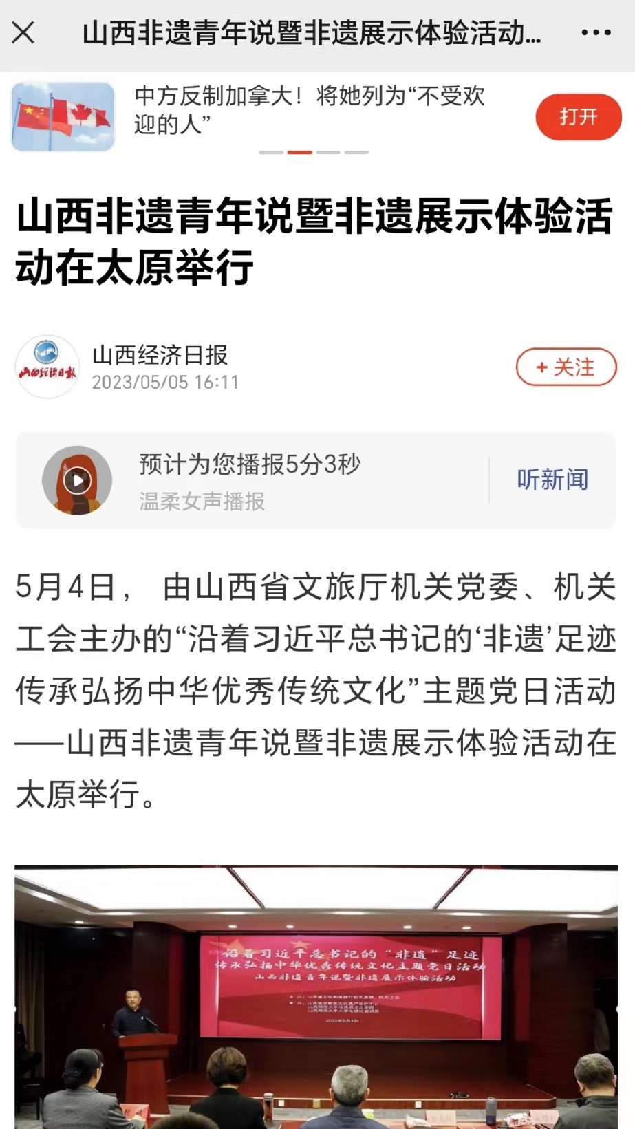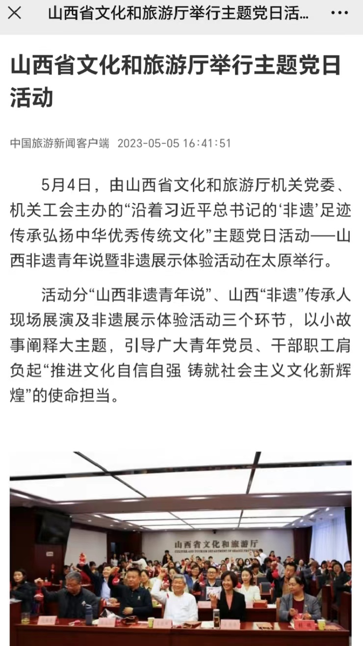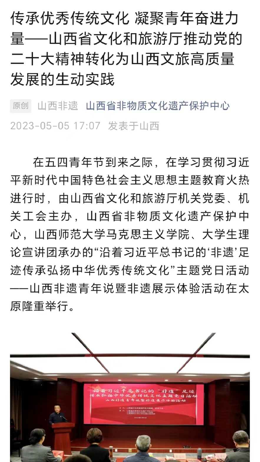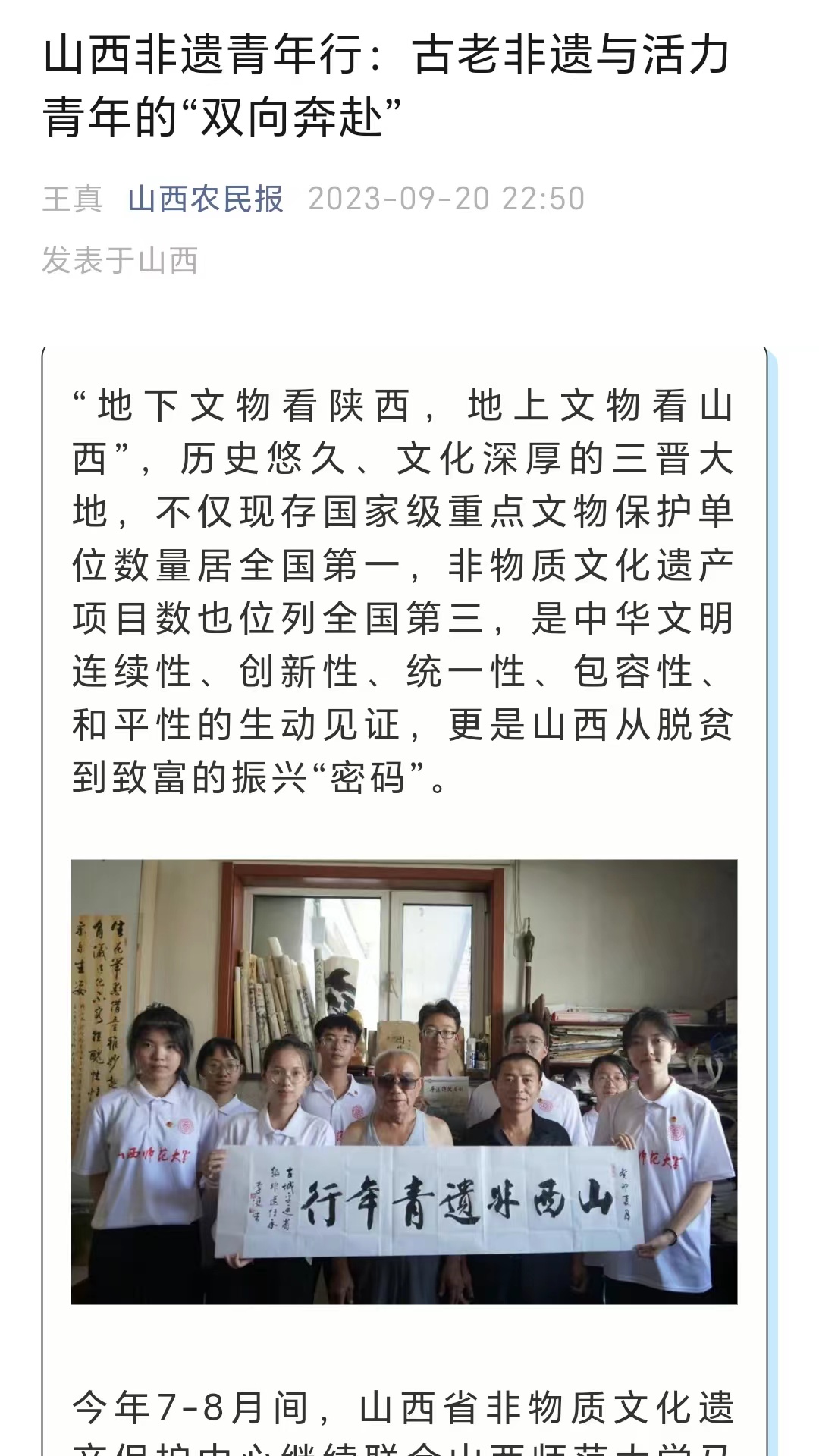 党的十八大以来,习近平总书记曾多次到山西考察调研,对文化传承作出重要指示、寄予殷切期望。为贯彻落实习近平总书记视察山西重要讲话精神,引导青年员工增强文化传承与创新的信心和决心,两年来,beat365唯一官网“山西非遗青年行”社会实践团队聚焦山西非遗,在山西省非物质文化遗产保护中心的大力支持下,开展了“山西非遗青年行+山西非遗青年说+山西非遗青年创+山西非遗青年研”系列活动,打造了“行—说—创—研”一体化研学流程,获得人民论坛网、人民日报视频客户端、人民网、中国青年报、文旅中国、山西省文旅厅、河南省文旅厅、山西日报山西青年报、山西农民报、中国老员工在线、高校辅导员工作室等多家权威机构和媒体的广泛报道。