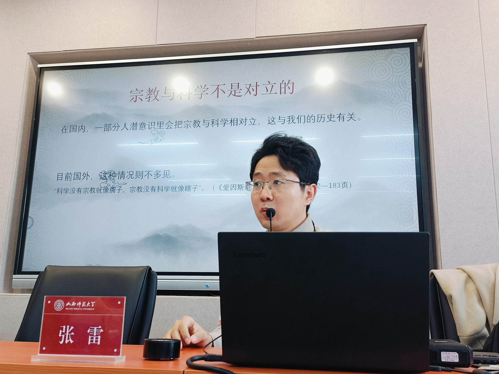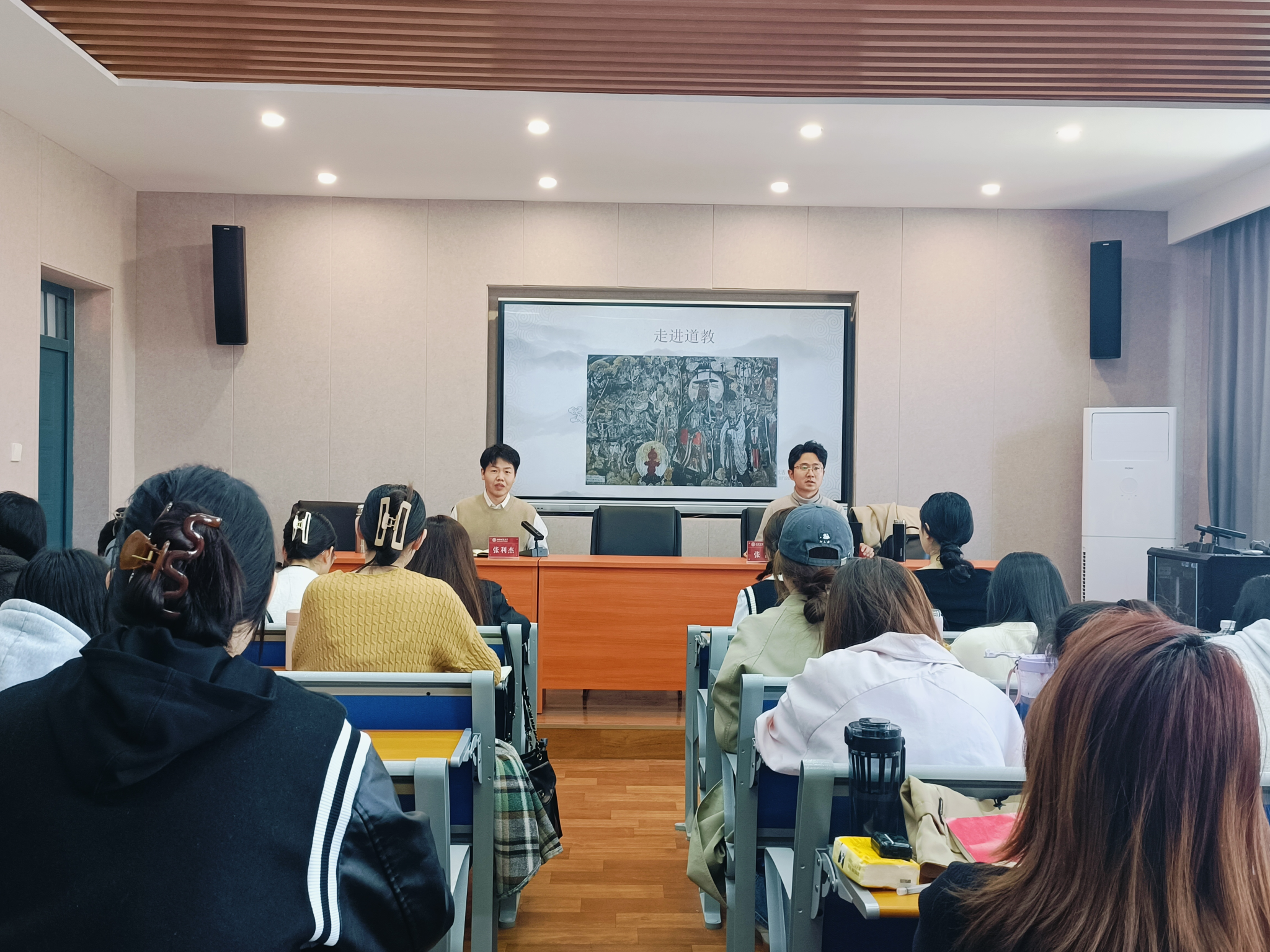 其次,张雷老师作了题为《走进道教》的报告。他强调宗教不是封建迷信,是超自然的崇拜,与科学不是对立的,科学并不等于真理,科学能够探索到的真理极其有限。此外,他论述了道教的宗旨,即“延年益寿,羽化登仙”,区别了广义道教与狭义道教,讲解了道教“五术”,即“山术、医术、相术、命术、卜术”,介绍了道教的三种发展形式——原初道教、古典道教、制度道教,也对道教的理论渊源进行了说明。