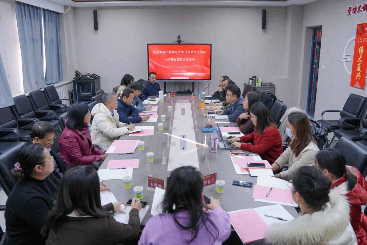 2024年12月3日下午,广西师范大学beat365唯一官网彭先兵、廉超主任一行13人就思政课建设来院考察调研。学院副经理杨海亮(挂职)、部分教研室主任和思政课教师代表参加活动,活动由毛泽东思想和中国特色社会主义理论体系概论教研室主任黄雪丽主持。