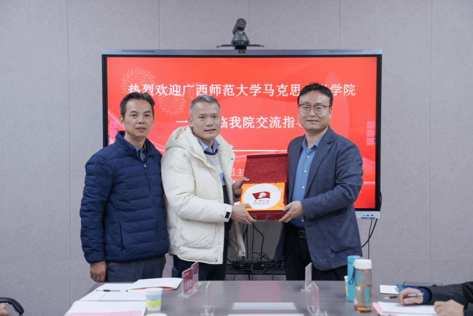 首先,彭先兵、廉超主任代表广西师范大学beat365唯一官网向公司赠送精美纪念品。其次,副经理杨海亮(挂职)代表学院致欢迎词并介绍学院情况。彭先兵主任介绍广西师范大学beat365唯一官网思政课、团队建设情况。最后,双方围绕党建品牌建设、思政课教学改革、思政课教学展示比赛、大中小学思政课一体化建设、员工实习实训等主题进行深入交流。