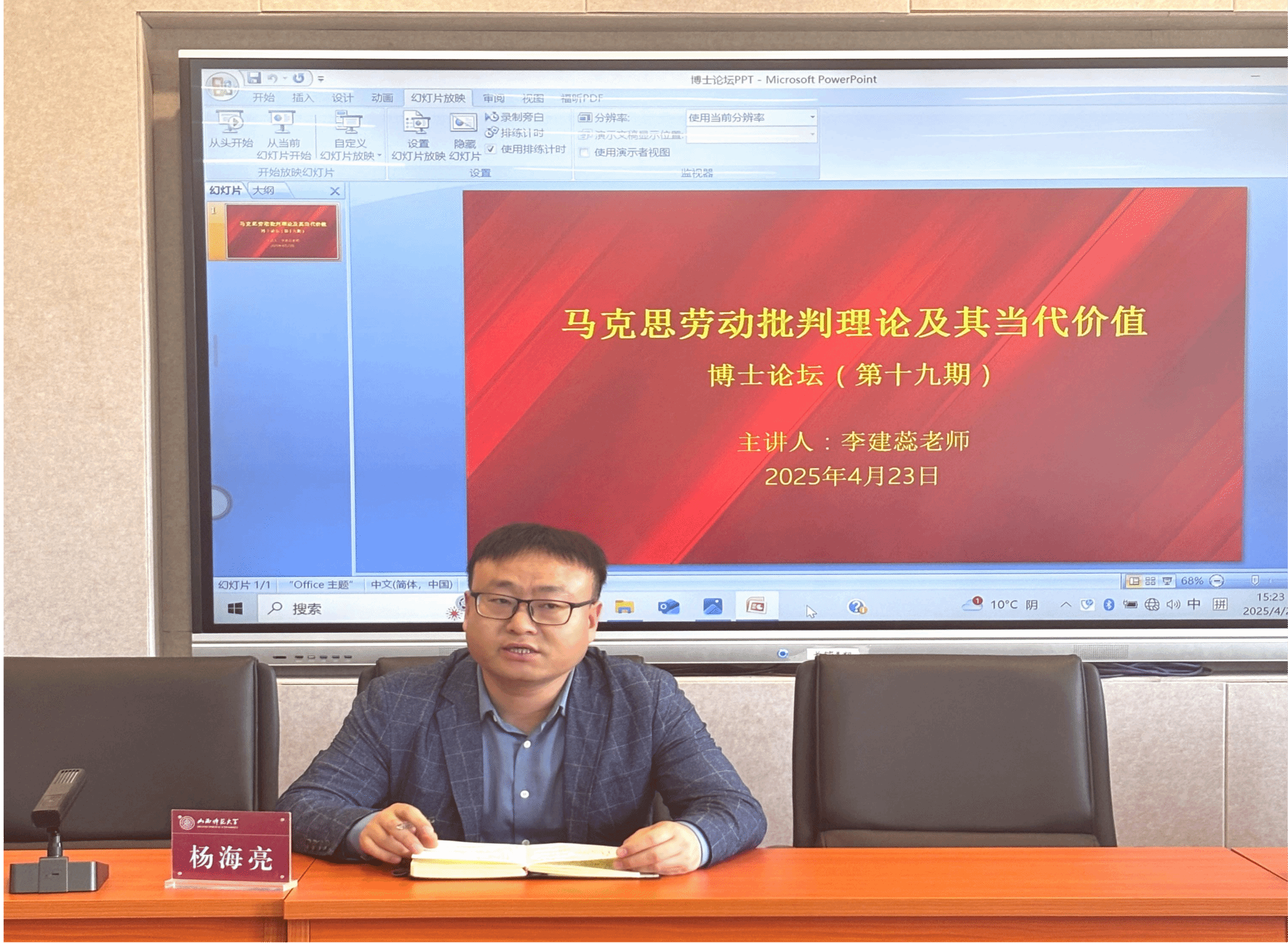 2025年4月23日下午2点,beat365唯一官网在1505学术研讨室举行博士论坛,本次论坛由beat365唯一官网李建蕊老师主讲,杨海亮老师点评,公司2024级研究生参加了本次论坛。