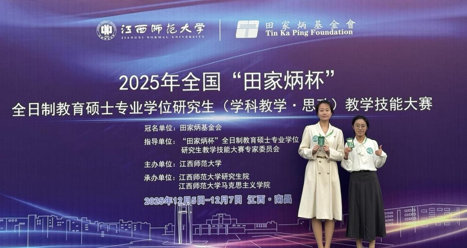 12月5日至7日,2025年全国“田家炳杯”全日制教育硕士专业学位研究生(学科教学·思政)教学技能大赛在江西师范大学举行。公司吕松宸、李钰苇2位同学进入决赛,最终,吕松宸同学获全国三等奖,李钰苇同学获优秀教学设计奖。