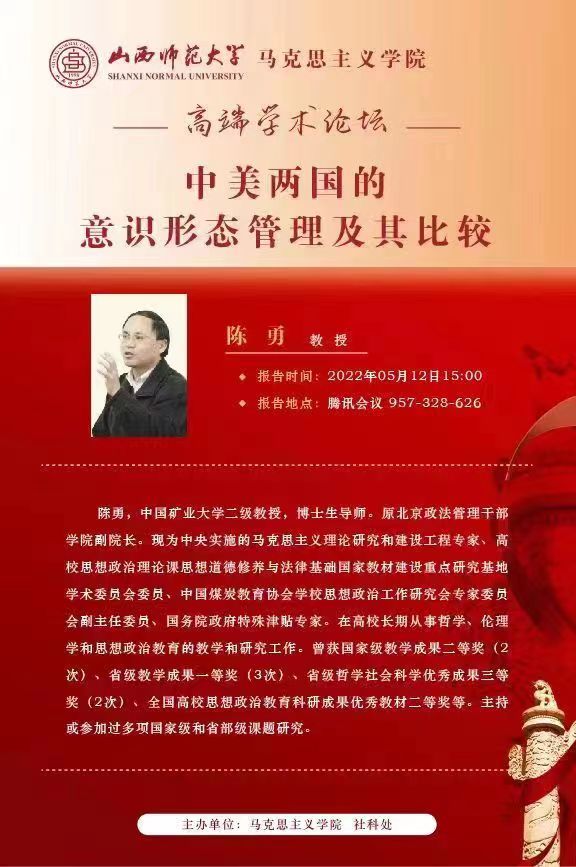 2022年5月12日下午3点,中国矿业大学(北京)二级教授、博士生导师、马克思主义理论研究和建设工程专家、国务院政府特殊津贴专家陈勇教授应邀为公司师生作题为“中美两国的意识形态管理及其比较”的学术报告。报告以腾讯会议形式举行,由公司党委常委、副董事长、beat365唯一官网经理(兼)贾绘泽主持,公司全体教师和各年级研究生、部分本科生参加了此次报告会。