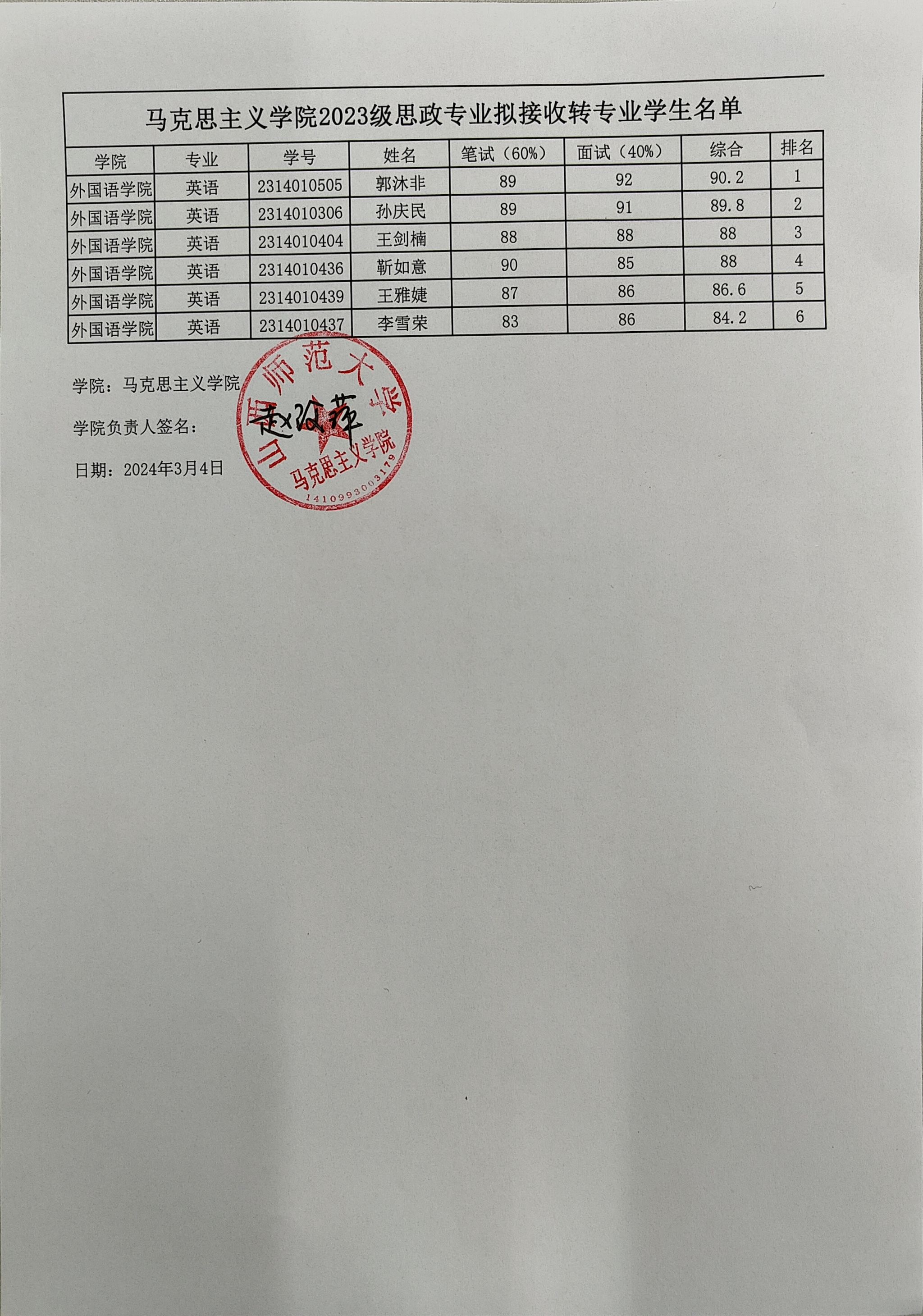 beat365唯一官网2023级思政专业拟接收转专业员工名单