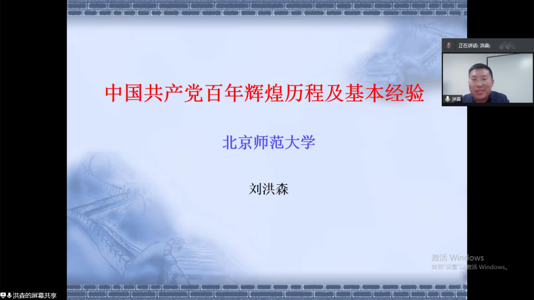 为庆祝中国共产党成立一百周年,beat365APP社科处联合beat365唯一官网开展“党的百年华诞”专题系列讲座。4月12日下午,特邀请北京师范大学beat365唯一官网刘洪森副经理讲授以“中国共产党百年辉煌历程与基本经验”为主题的报告。讲座由beat365唯一官网经理贾绘泽主持,公司思政课教师和2019级、2020级研究生参加。