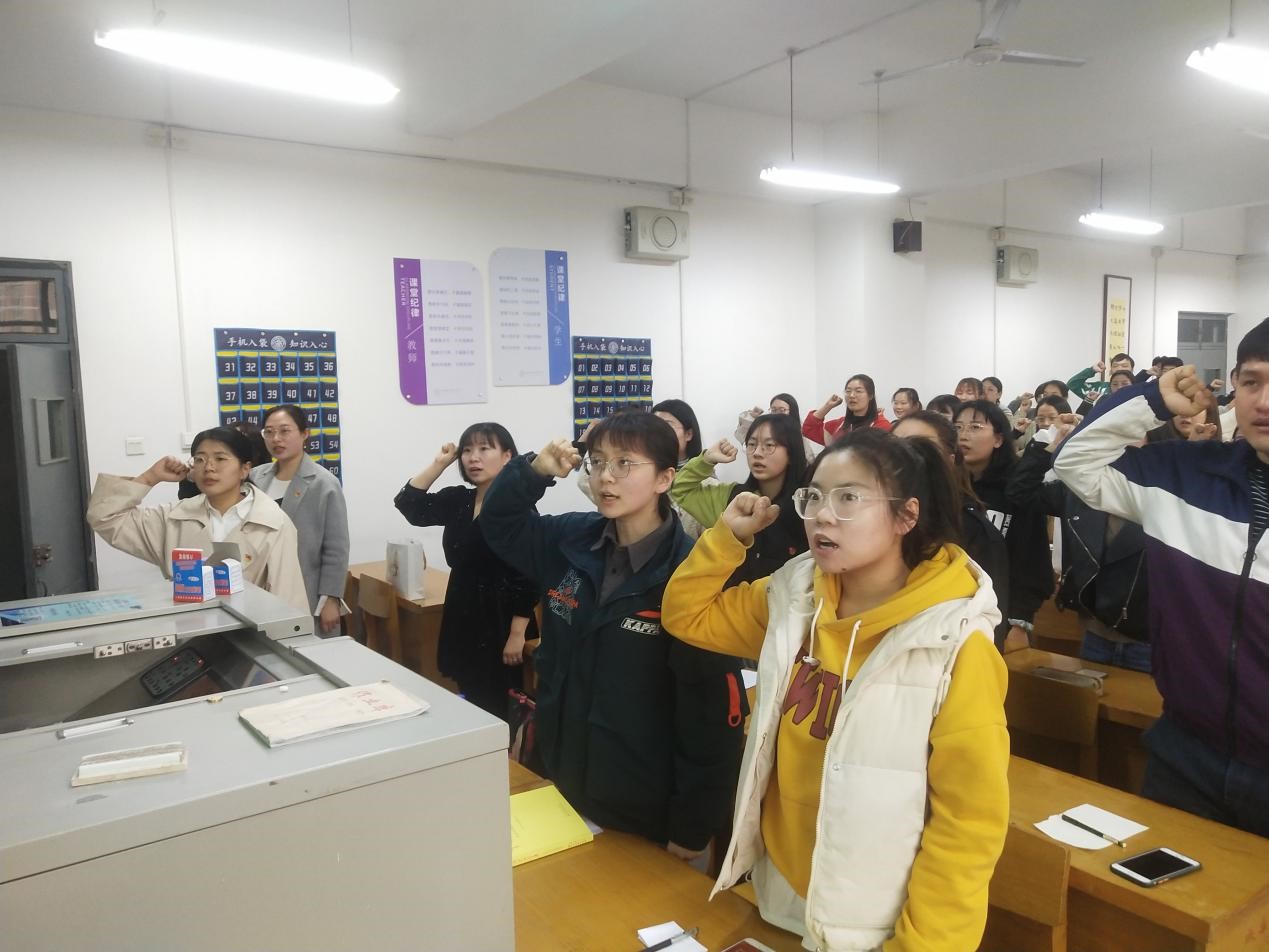 李丽丽老师组织入党介绍人分别介绍39发展党员的基本情况,经支部大会正式党员投票通过了39名发展对象申请并接收其为预备党员,最后全体支部成员共同宣誓。全体发展党员填写了“预备党员承诺书”拍照发朋友圈并配文“今天我成为了预备党员!这是我的承诺”,请全体同学共同监督,承诺认真做好一名预备党员。