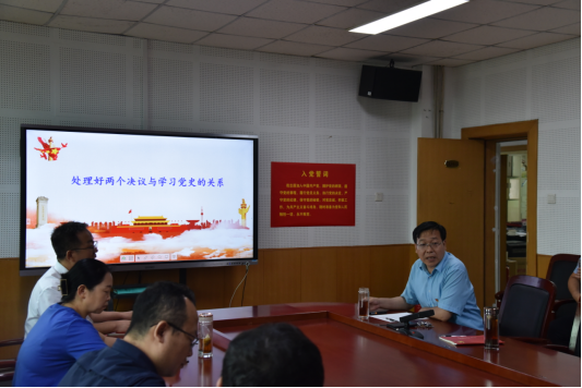 第三阶段,贾绘泽经理为全体教职工党员讲授题为“处理好两个决议与学习党史的关系”的党课。他从“两个决议”的提出背景、主要内容以及历史地位出发,阐明“两个决议”是学习党史的根本遵循和依据、“两个决议”蕴涵着学习党史的科学方法论,引导大家在“两个决议”的基础上深化对党的历史的认识,并指出“两个决议”后的党史学习要遵循党的其他相关文献。