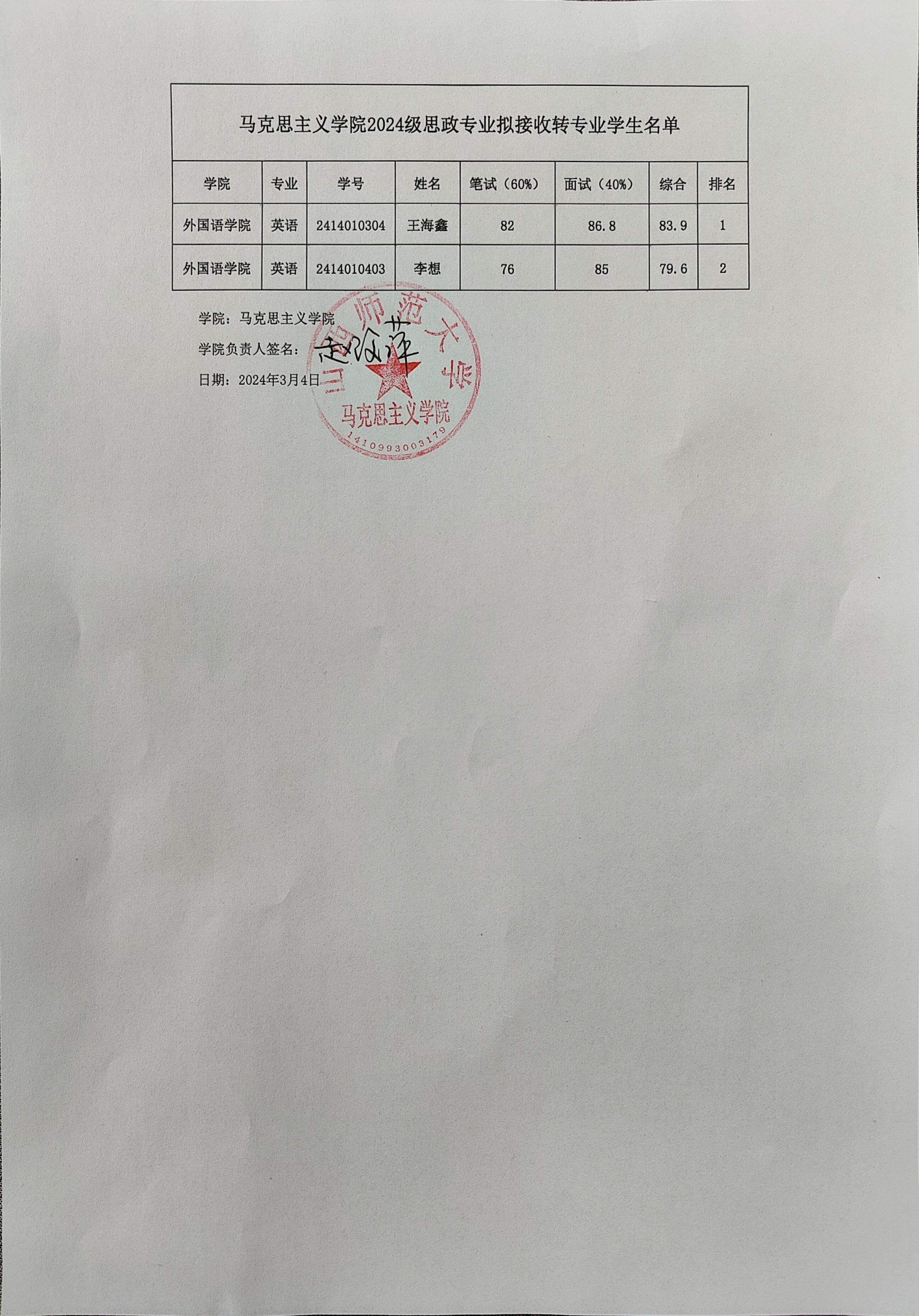beat365唯一官网2024级思政专业拟接收转专业员工名单