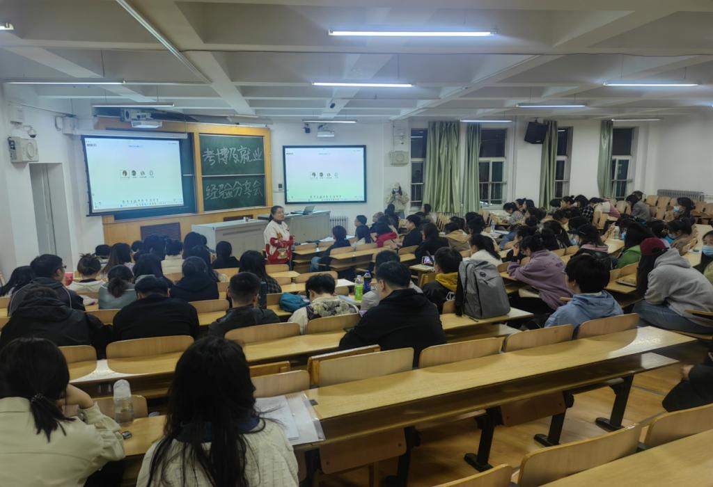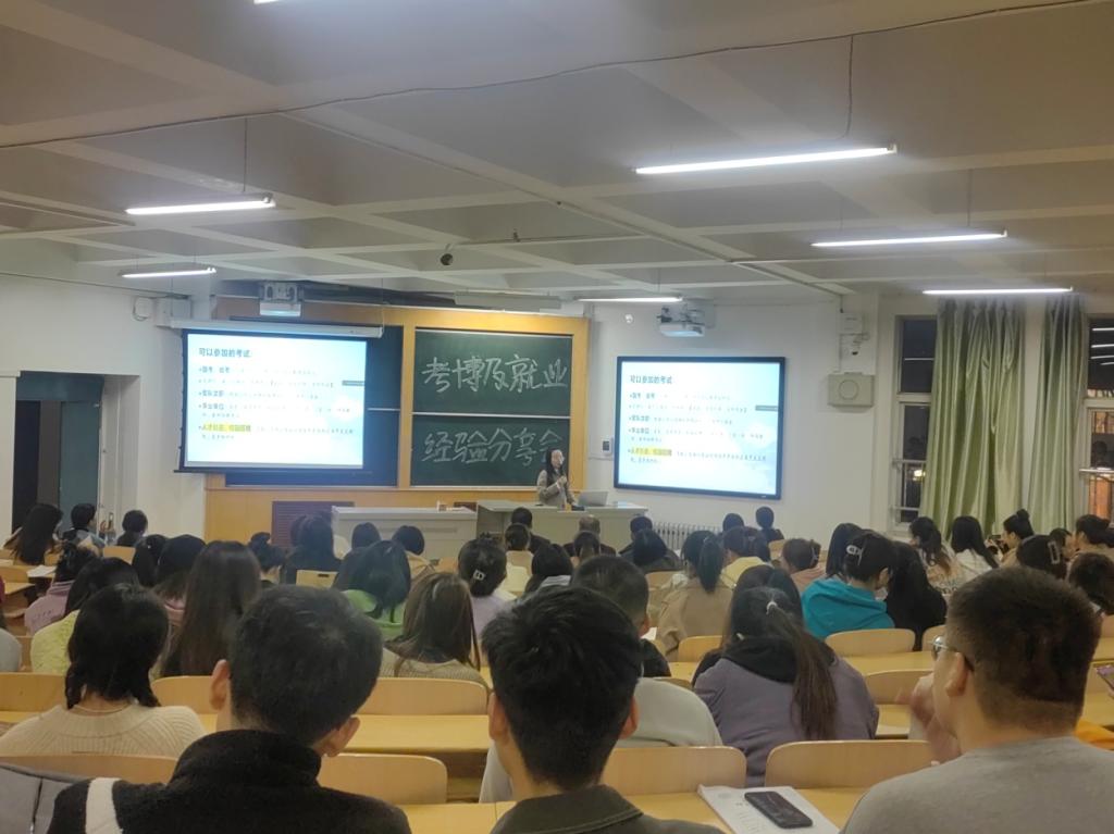 首先,葛秀琴老师对本次分享交流会作了简单介绍。她指出,学院举办此次分享会,基于同学们就业及考博需求,旨在让同学们更好地了解就业形势,规划好未来。希望同学们通过此次就业及考博经验分享会能有所收获。