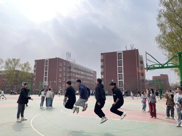 同学们配合默契、节奏和谐,在挥动的大绳下跃动着灵动如鹿、矫健似鹰、轻盈若燕的身姿,每个同学都尽自己的最大努力与大家同频共振,他们一个接一个,跳跃无断绝,恰似如火青春,并肩战斗将跳大绳跳出了新的高度。