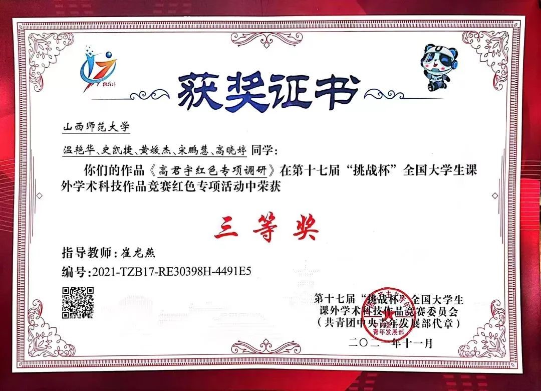 宋鹏慧与团队四位成员申报的作品《高君宇红色专项调研》成功入围,荣获全国三等奖、省级一等奖以及“最具感染力奖”。